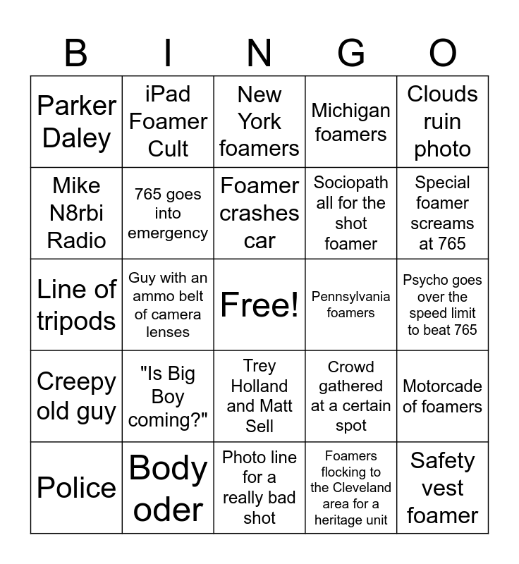 This bingo card has a free space and 24 words: "Is Big Boy coming?", Body oder, Foamer crashes car, Police, Clouds ruin photo, Parker Daley, Mike N8rbi Radio, iPad Foamer Cult, Pennsylvania foamers, Trey Holland and Matt Sell, Sociopath all for the shot foamer, Line of tripods, Crowd gathered at a certain spot, Motorcade of foamers, 765 goes into emergency, Foamers flocking to the Cleveland area for a heritage unit, Psycho goes over the speed limit to beat 765, New York foamers, Special foamer screams at 765, Guy with an ammo belt of camera lenses, Safety vest foamer, Creepy old guy, Michigan foamers and Photo line for a really bad shot.