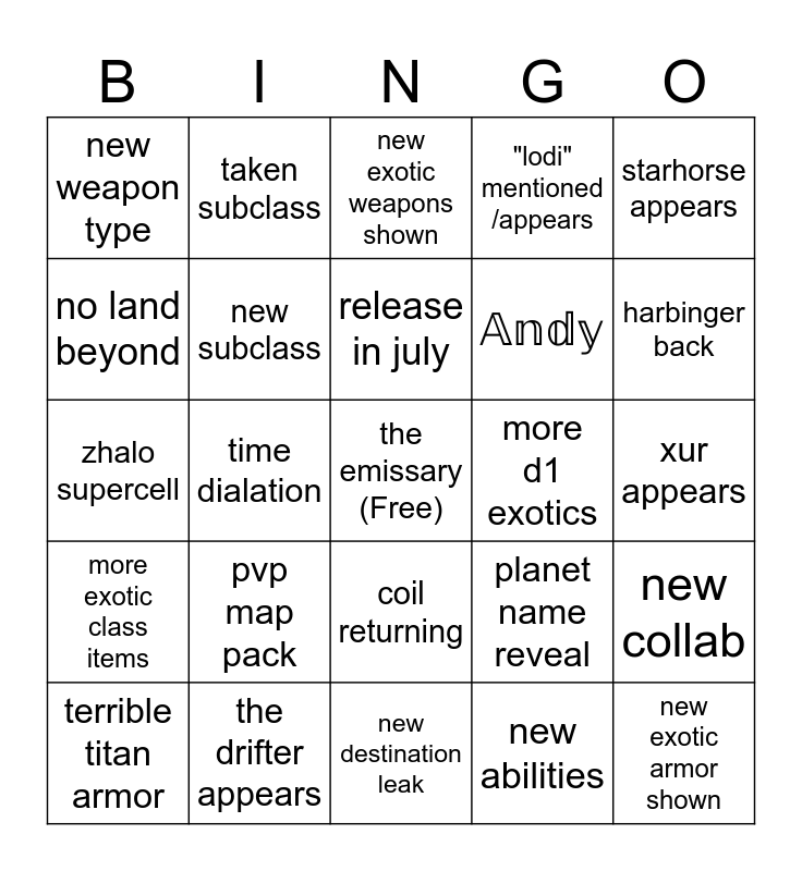 This bingo card has a free space and 24 words: pvp map pack, the drifter appears, release in july, terrible titan armor, starhorse appears, new weapon type, no land beyond, taken subclass, more d1 exotics, coil returning, πΈπππͺ, zhalo supercell, planet name reveal, new collab, new subclass, new abilities, xur appears, new exotic weapons shown, harbinger back, time dialation, new exotic armor shown, more exotic class items, "lodi" mentioned /appears and new destination leak.