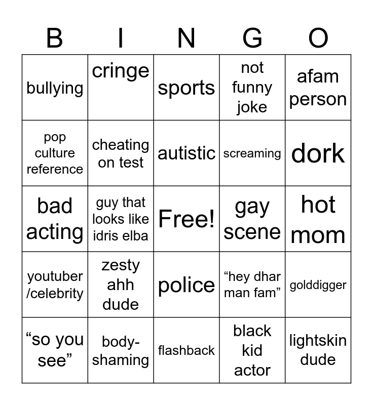 This bingo card has a free space and 24 words: zesty ahh dude, body-shaming, autistic, “so you see”, afam person, bullying, pop culture reference, cringe, gay scene, police, screaming, bad acting, “hey dhar man fam”, golddigger, cheating on test, black kid actor, hot mom, sports, dork, guy that looks like idris elba, lightskin dude, youtuber /celebrity, not funny joke and flashback.