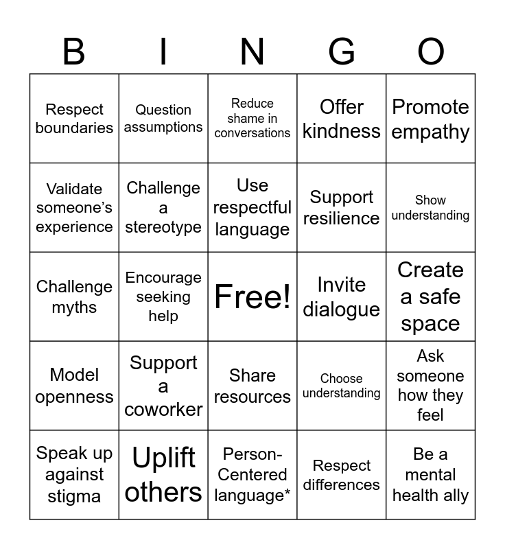 This bingo card has a free space and 37 words: Speak openly about mental health, Share a mental health fact, Listen without judgment, Challenge a stereotype, Ask someone how they feel, Support a coworker, Use respectful language, Correct misinformation, Promote empathy, Educate yourself, Encourage seeking help, Offer kindness, Be a mental health ally, Create a safe space, Validate someone’s experience, Model openness, Acknowledge common struggles, Reduce shame in conversations, Share resources, Invite dialogue, Respect boundaries, Show understanding, Speak up against stigma, Person-Centered language*, Listen without judgment, Respect differences, Question assumptions, Push for inclusion, Check your bias, Promote dignity, Spread awareness, Uplift others, Challenge myths, Offer validation, Choose understanding, Support resilience and Foster hope.