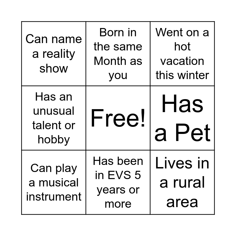 This bingo card has a free space and 8 words: Has a Pet, Went on a hot vacation this winter, Born in the same Month as you, Can play a musical instrument, Can name a reality show, Lives in a rural area, Has an unusual talent or hobby and Has been in EVS 5 years or more.