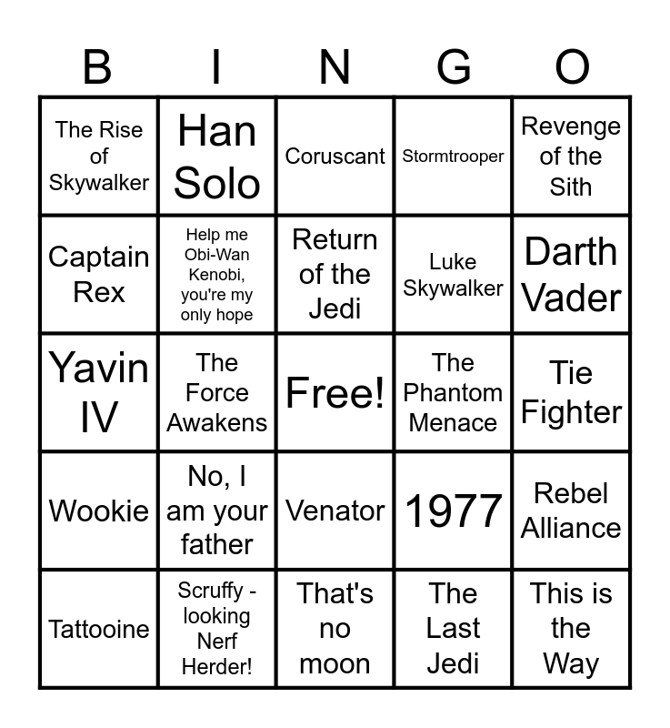 This bingo card has a free space and 49 words: X-Wing, This is the Way, May the Force with you, That's no moon, No, I am your father, Millennium Falcon, Han Solo, Cassian Andor, Captain Rex, Princess Leia, Help me Obi-Wan Kenobi, you're my only hope, Stormtrooper, Rebel Alliance, 1977, A New Hope, The Empire Strikes Back, Return of the Jedi, The Phantom Menace, Attack of the Clones, Revenge of the Sith, The Force Awakens, The Last Jedi, The Rise of Skywalker, Luke Skywalker, General Grievous, Darth Vader, Tattooine, Death Star, Venator, Wookie, Ewok, Jawa, Wedge Antilles, Poe Dameron, Scruffy -looking Nerf Herder!, Lightsaber, Emperor Palpatine, Boba Fett, Tie Fighter, Darth Maul, R2-D2, C-3PO, K-2SO, Grand Moff Tarkin, Yavin IV, Coruscant, Mustafar, Obi-Wan and Rebel Alliance.