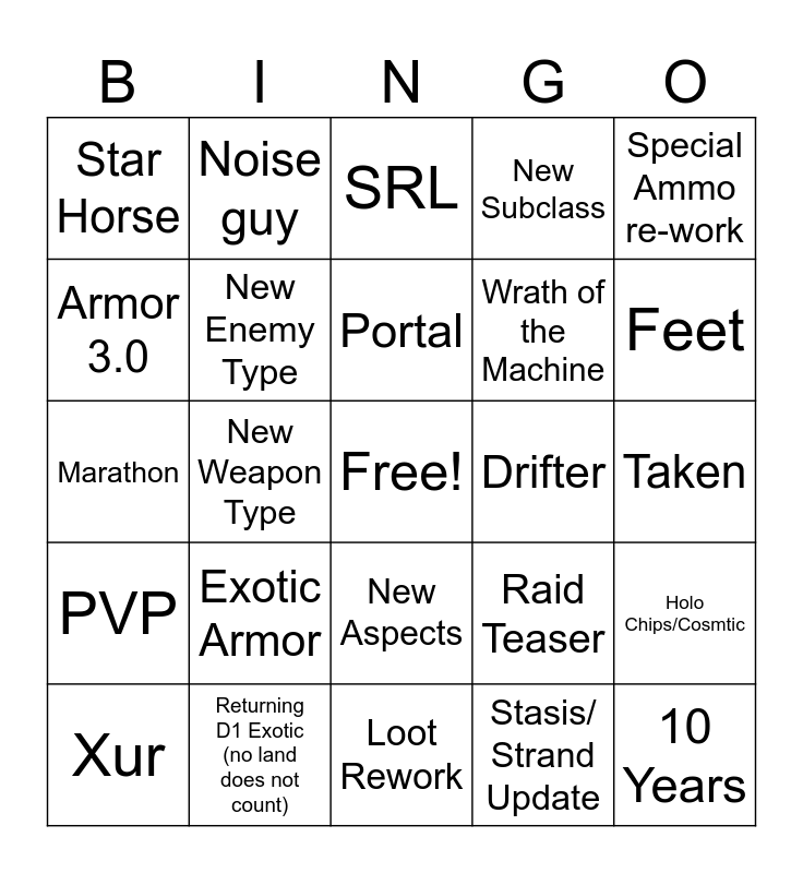 This bingo card has a free space and 24 words: Exotic Armor, Returning D1 Exotic (no land does not count), Portal, Xur, Special Ammo re-work, Star Horse, Armor 3.0, Noise guy, Drifter, New Aspects, Wrath of the Machine, Marathon, Raid Teaser, Holo Chips/Cosmtic, New Enemy Type, Stasis/ Strand Update, Taken, SRL, Feet, New Weapon Type, 10 Years, PVP, New Subclass and Loot Rework.