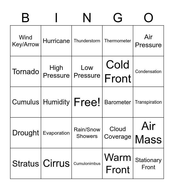 This bingo card has a free space and 28 words: Air Mass, Front, Cold Front, Warm Front, Tornado, Thunderstorm, Hurricane, Drought, Barometer, Stratus, Cumulus, Thermometer, Cirrus, Cumulonimbus, Condensation, Precipitation, Evaporation, High Pressure, Low Pressure, Rain/Snow Showers, Wind Key/Arrow, Occluded Front, Stationary Front, Humidity, Transpiration, Cloud Coverage, Air Pressure and Air Temperature.
