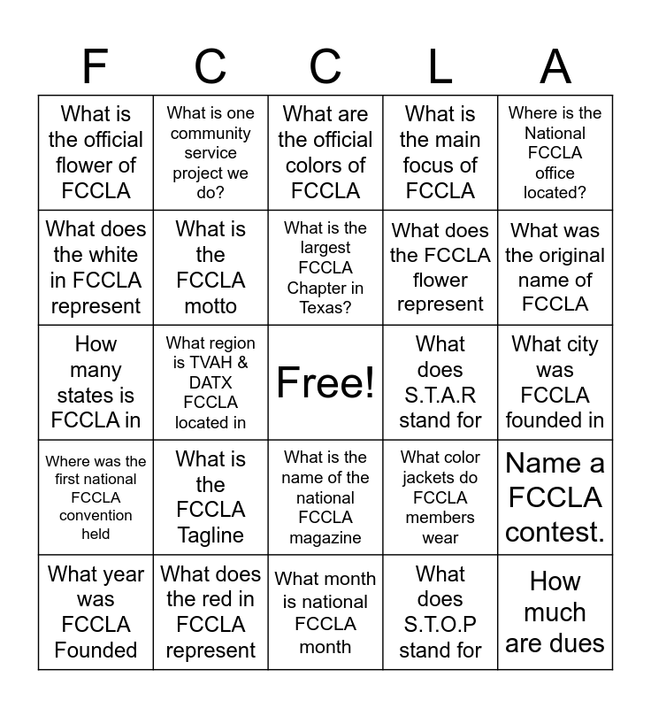This bingo card has a free space and 29 words: What year was FCCLA Founded, What year did the name change from FHA to FCCLA, What region is TVAH & DATX FCCLA located in, Who is the current FCCLA President, What is the official flower of FCCLA, What are the official colors of FCCLA, What is the FCCLA motto, What is the FCCLA Tagline, What does S.T.A.R stand for, What does the red in FCCLA represent, What city was FCCLA founded in, How much are dues, What month is national FCCLA month, What does S.T.O.P stand for, What was the original name of FCCLA, When did FHA have their first male national officer, What is the name of the national FCCLA magazine, Where was the first national FCCLA convention held, Where is the National FCCLA office located?, How many states is FCCLA in, What color jackets do FCCLA members wear, How many purposes does FCCLA have, What does the FCCLA flower represent, What does the white in FCCLA represent, What is the main focus of FCCLA, What is one community service project we do?, Name a FCCLA contest., What is the largest FCCLA Chapter in Texas? and What does FCCLA stand for.