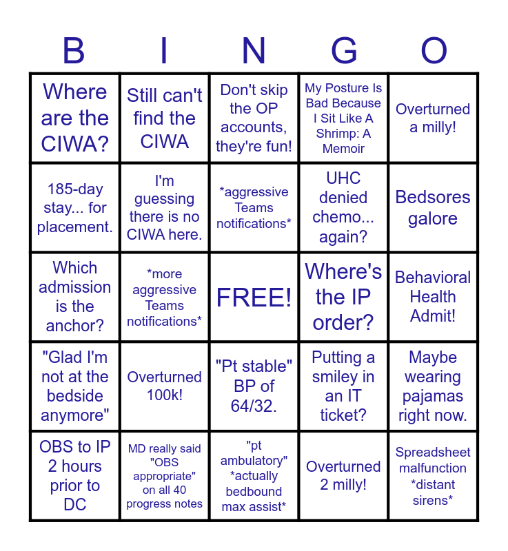 This bingo card has a free space and 24 words: Overturned 100k!, MD really said "OBS appropriate" on all 40 progress notes, *aggressive Teams notifications*, OBS to IP 2 hours prior to DC, Overturned a milly!, Where are the CIWA?, 185-day stay... for placement., Still can't find the CIWA, Where's the IP order?, "Pt stable" BP of 64/32., UHC denied chemo... again?, Which admission is the anchor?, Putting a smiley in an IT ticket?, Maybe wearing pajamas right now., I'm guessing there is no CIWA here., Overturned 2 milly!, Behavioral Health Admit!, Don't skip the OP accounts, they're fun!, Bedsores galore, *more aggressive Teams notifications*, Spreadsheet malfunction *distant sirens*, "Glad I'm not at the bedside anymore", My Posture Is Bad Because I Sit Like A Shrimp: A Memoir and "pt ambulatory" *actually bedbound max assist*.