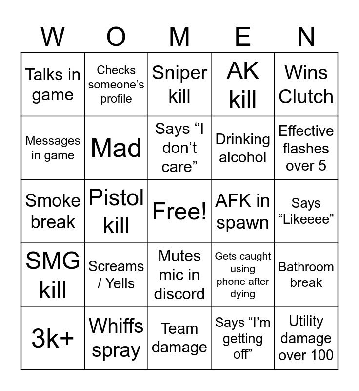 This bingo card has a free space and 26 words: Mutes mic in discord, Says “I’m getting off”, Says “I don’t care”, Whiffs spray, Wins Clutch, Talks in game, Messages in game, Checks someone’s profile, Says “Likeeee”, Gets caught using phone after dying, Drinking alcohol, Smoke break, Bathroom break, 3k+, Pistol kill, M4 kill, AK kill, SMG kill, Sniper kill, Utility damage over 100, Effective flashes over 5, Team damage, AFK in spawn, Screams / Yells, Mad and Loses clutch.