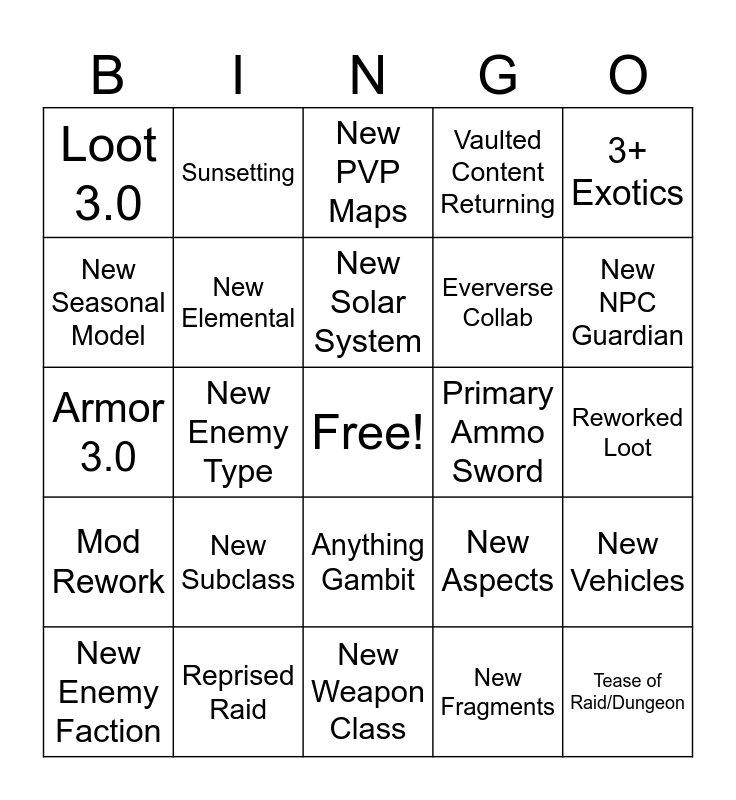 This bingo card has a free space and 24 words: New Subclass, Reprised Raid, New Solar System, New Enemy Faction, 3+ Exotics, Loot 3.0, New Seasonal Model, Sunsetting, Primary Ammo Sword, Anything Gambit, Eververse Collab, Armor 3.0, New Aspects, New Vehicles, New Elemental, New Fragments, Reworked Loot, New PVP Maps, New NPC Guardian, New Enemy Type, Tease of Raid/Dungeon, Mod Rework, Vaulted Content Returning and New Weapon Class.