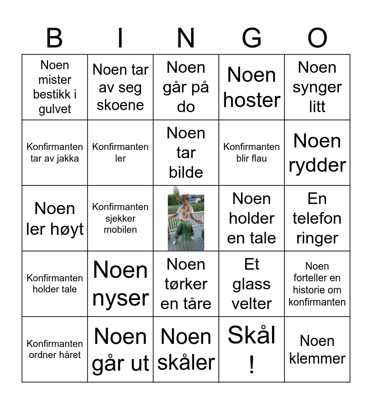 This bingo card has a free space and 24 words: Noen nyser, Noen går ut, Noen tar bilde, Konfirmanten ordner håret, Noen synger litt, Noen mister bestikk i gulvet, Konfirmanten tar av jakka, Noen tar av seg skoene, Noen holder en tale, Noen tørker en tåre, Konfirmanten blir flau, Noen ler høyt, Et glass velter, Noen forteller en historie om konfirmanten, Konfirmanten ler, Skål !, En telefon ringer, Noen går på do, Noen rydder, Konfirmanten sjekker mobilen, Noen klemmer, Konfirmanten holder tale, Noen hoster and Noen skåler.
