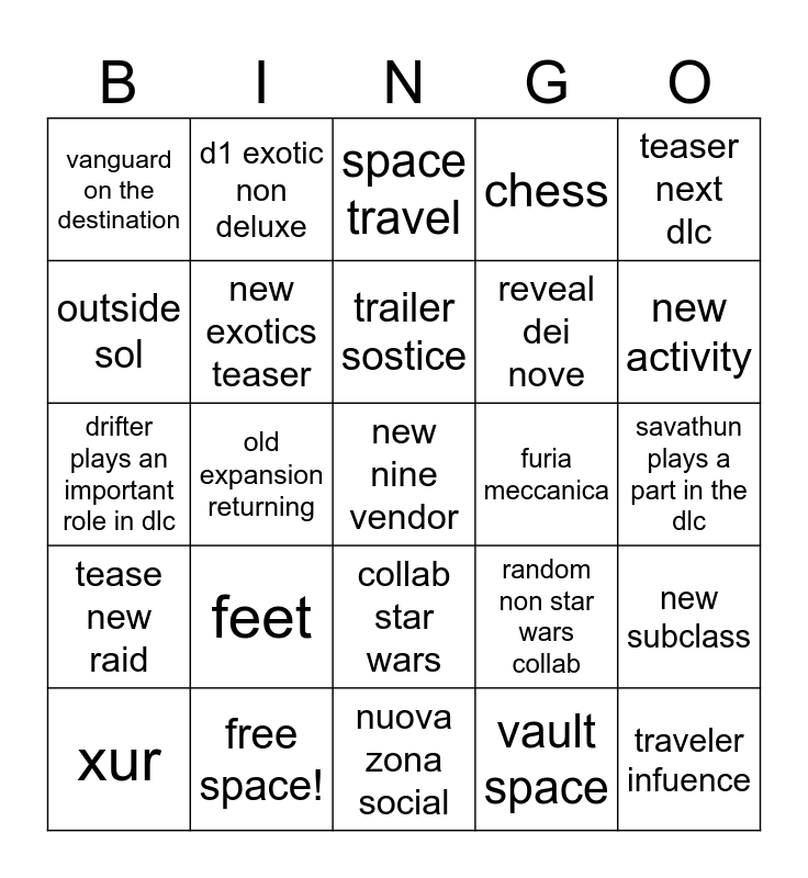This bingo card has a free space and 24 words: feet, free space!, trailer sostice, xur, teaser next dlc, vanguard on the destination, outside sol, d1 exotic non deluxe, furia meccanica, collab star wars, reveal dei nove, drifter plays an important role in dlc, random non star wars collab, new subclass, new exotics teaser, vault space, savathun plays a part in the dlc, space travel, new activity, old expansion returning, traveler infuence, tease new raid, chess and nuova zona social.