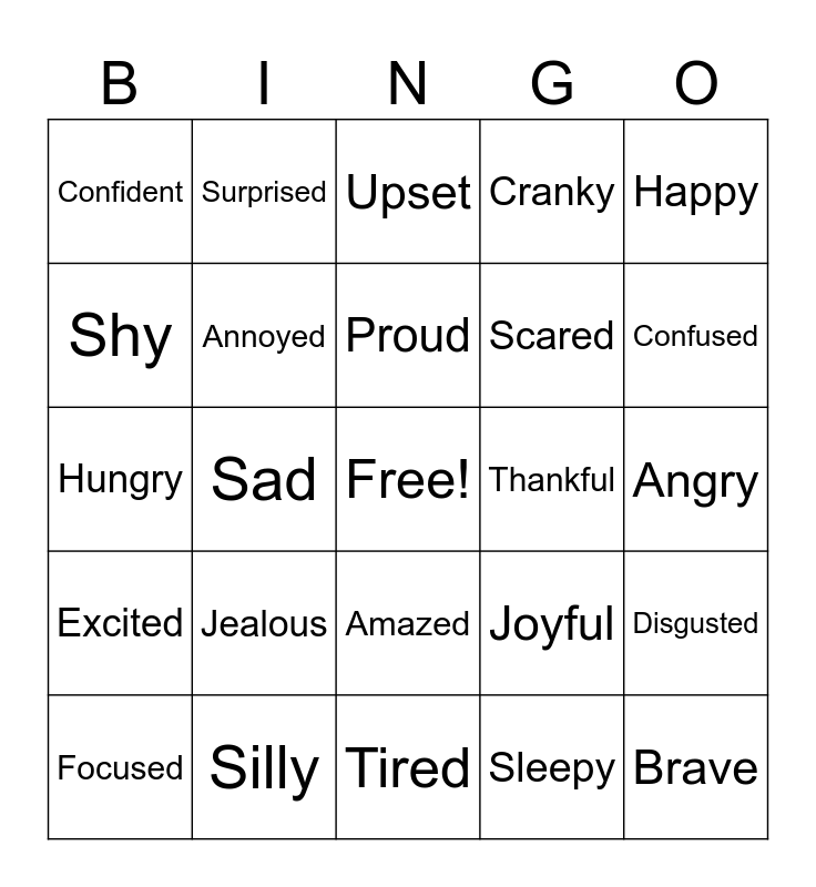 This bingo card has a free space and 24 words: Jealous, Silly, Proud, Focused, Happy, Confident, Shy, Surprised, Thankful, Amazed, Scared, Hungry, Joyful, Disgusted, Annoyed, Sleepy, Angry, Upset, Confused, Sad, Brave, Excited, Cranky and Tired.
