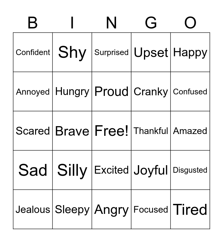 This bingo card has a free space and 24 words: Jealous, Silly, Proud, Focused, Happy, Confident, Shy, Surprised, Thankful, Amazed, Scared, Hungry, Joyful, Disgusted, Annoyed, Sleepy, Angry, Upset, Confused, Sad, Brave, Excited, Cranky and Tired.
