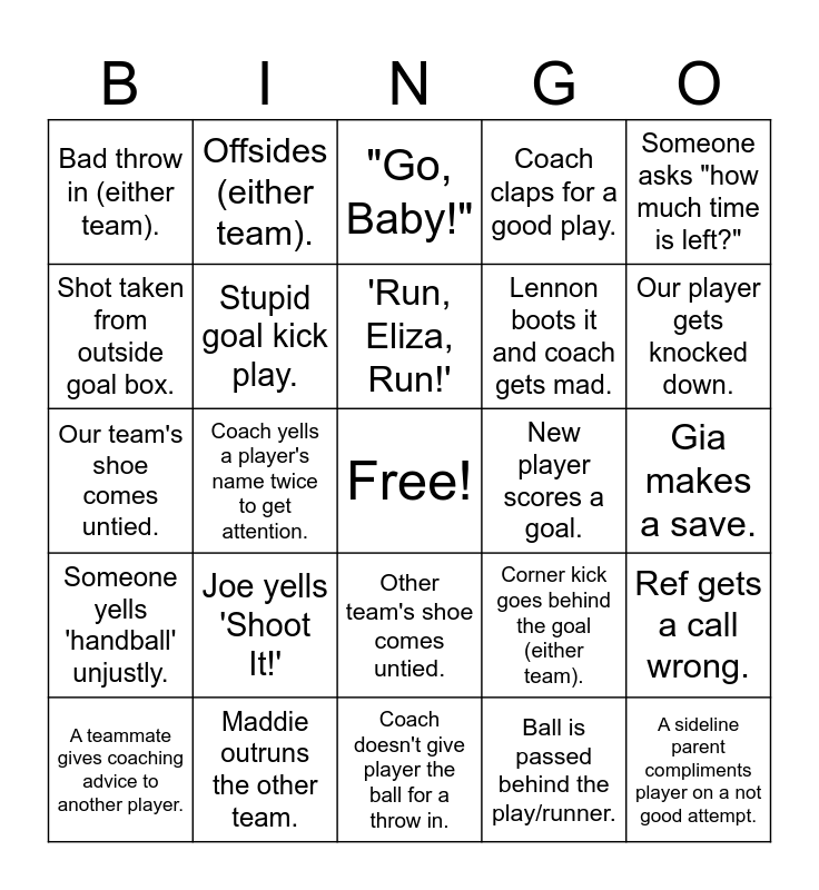 This bingo card has a free space and 24 words: Joe yells 'Shoot It!', Maddie outruns the other team., 'Run, Eliza, Run!', A teammate gives coaching advice to another player., Someone asks "how much time is left?", Bad throw in (either team)., Shot taken from outside goal box., Offsides (either team)., New player scores a goal., Other team's shoe comes untied., Lennon boots it and coach gets mad., Our team's shoe comes untied., Corner kick goes behind the goal (either team)., Ref gets a call wrong., Stupid goal kick play., Ball is passed behind the play/runner., Gia makes a save., "Go, Baby!", Our player gets knocked down., Coach yells a player's name twice to get attention., A sideline parent compliments player on a not good attempt., Someone yells 'handball' unjustly., Coach claps for a good play. and Coach doesn't give player the ball for a throw in..