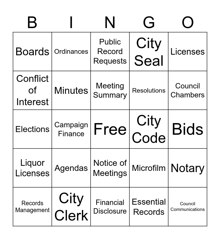 This bingo card has a free space and 24 words: Agendas, City Clerk, Meeting Summary, Records Management, Licenses, Boards, Conflict of Interest, Ordinances, City Code, Notice of Meetings, Resolutions, Elections, Microfilm, Notary, Minutes, Essential Records, Bids, Public Record Requests, Council Chambers, Campaign Finance, Council Communications, Liquor Licenses, City Seal and Financial Disclosure.