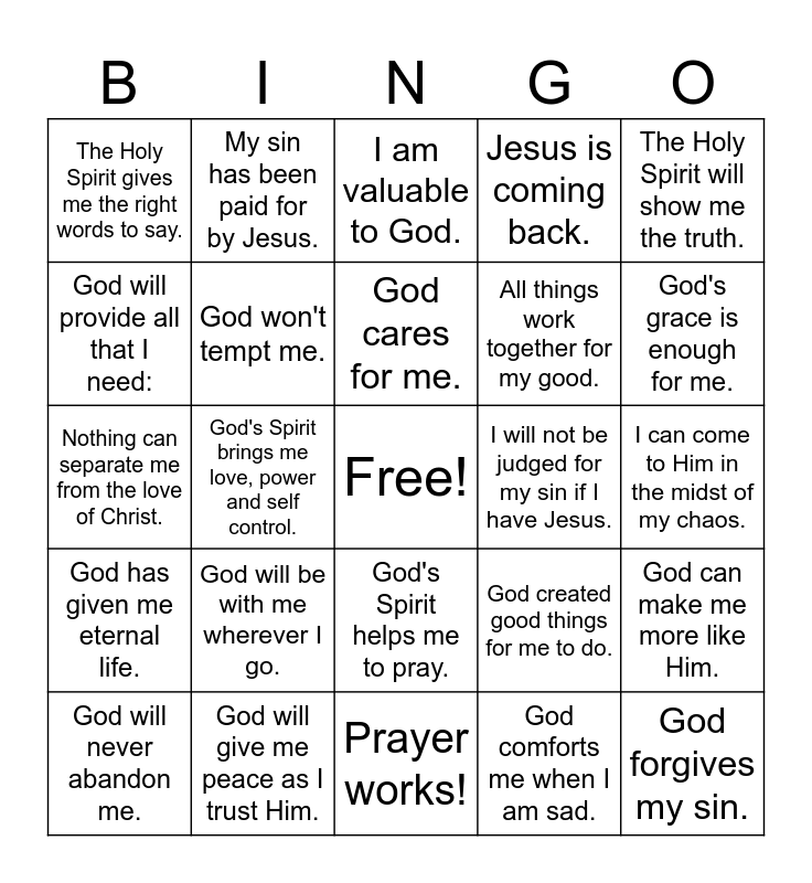 This bingo card has a free space and 24 words: God will be with me wherever I go., God will give me peace as I trust Him., God cares for me., God will never abandon me., The Holy Spirit will show me the truth., The Holy Spirit gives me the right words to say., God will provide all that I need:, My sin has been paid for by Jesus., I will not be judged for my sin if I have Jesus., God's Spirit helps me to pray., All things work together for my good., Nothing can separate me from the love of Christ., God created good things for me to do., God can make me more like Him., God won't tempt me., God comforts me when I am sad., I can come to Him in the midst of my chaos., I am valuable to God., God's grace is enough for me., God's Spirit brings me love, power and self control., God forgives my sin., God has given me eternal life., Jesus is coming back. and Prayer works!.