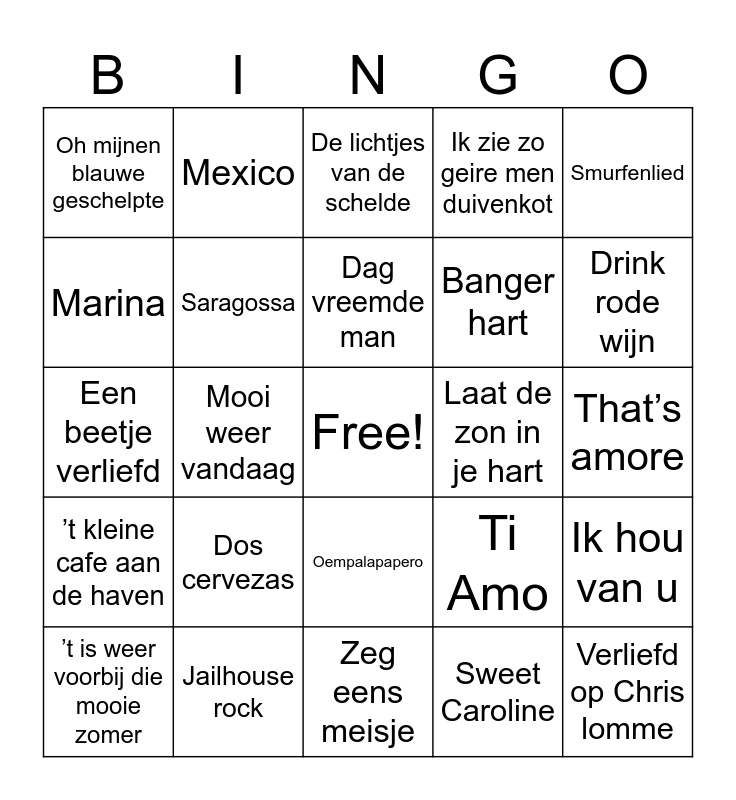 This bingo card has a free space and 26 words: Oempalapapero, Sweet Caroline, Dag vreemde man, Jailhouse rock, Smurfenlied, Oh mijnen blauwe geschelpte, Marina, Mexico, That’s amore, Ti Amo, Banger hart, Een beetje verliefd, Ik hou van u, ’t is weer voorbij die mooie zomer, Mooi weer vandaag, Twee motten, Ik zie zo geire men duivenkot, ’t kleine cafe aan de haven, De lichtjes van de schelde, Verliefd op Chris lomme, Drink rode wijn, Zeg eens meisje, Laat de zon in je hart, Dos cervezas, Saragossa and Engelbewaarder.
