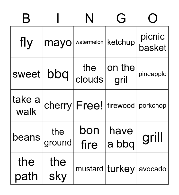 This bingo card has a free space and 24 words: the ground, the sky, the clouds, the path, picnic basket, fly, sweet, mayo, firewood, bon fire, on the gril, take a walk, have a bbq, grill, bbq, turkey, porkchop, watermelon, pineapple, cherry, avocado, beans, ketchup and mustard.