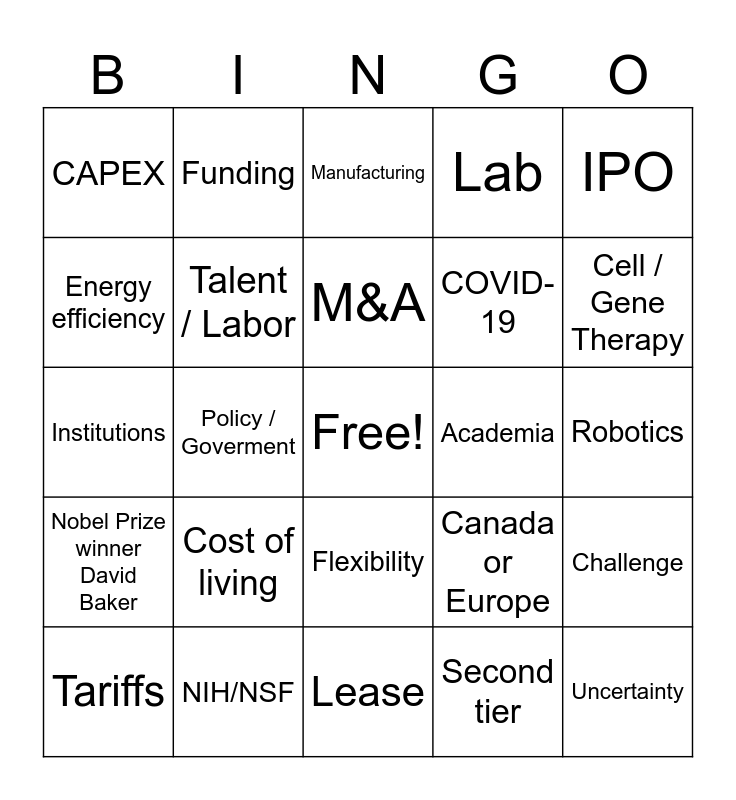 This bingo card has a free space and 28 words: Challenge, Vacancy rate, COVID-19, Second tier, Energy efficiency, Manufacturing, Funding, Nobel Prize winner David Baker, Academia, Tariffs, Institutions, Lab, NIH/NSF, Lease, Cell / Gene Therapy, PPP, Cost of living, Talent / Labor, M&A, Flexibility, CAPEX, AI, Uncertainty, Policy / Goverment, Robotics, Canada or Europe, IPO and Series Spend.