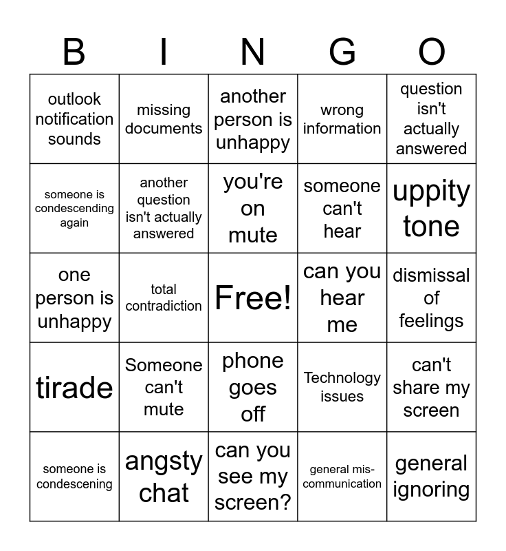 This bingo card has a free space and 24 words: Someone can't mute, angsty chat, you're on mute, someone is condescening, question isn't actually answered, outlook notification sounds, someone is condescending again, missing documents, can you hear me, phone goes off, someone can't hear, one person is unhappy, Technology issues, can't share my screen, another question isn't actually answered, general mis-communication, dismissal of feelings, another person is unhappy, uppity tone, total contradiction, general ignoring, tirade, wrong information and can you see my screen?.