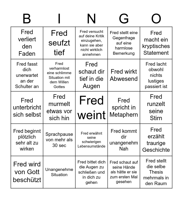 This bingo card has a free space and 24 words: Sprachpause von mehr als 30 sec, Unangenehme Situation, Fred schaut dir tief in die Augen, Fred wird von Gott beschützt, Fred macht ein kryptisches Statement, Fred verliert den Faden, Fred fasst dich unerwartet an der Schulter an, Fred seufzt tief, Fred spricht in Metaphern, Fred erwähnt seine schwierigen Lebensumstände, Fred wirkt Abwesend, Fred unterbricht sich selbst, Fred kommt dir unangenehm Nah, Fred erzählt traurige Geschichte, Fred verharmlost eine schlimme Situation mit dem Willen Gottes, Fred schaut auf seine Hände als hätte er sie zum ersten Mal gesehen, Fred runzelt seine Stirn, Fred versucht auf deine Kritik einzugehen, kann sie aber nicht wirklich annehmen, Fred lacht obwohl nichts lustiges passiert ist, Fred murmelt etwas vor sich hin, Fred stellt die selbe Thesis mehrmals in den Raum, Fred beginnt plötzlich sehr alt zu wirken, Fred stellt eine Gegenfrage auf eine harmlose Bemerkung and Fred bittet dich die Augen zu schließen und in dich zu gehen.