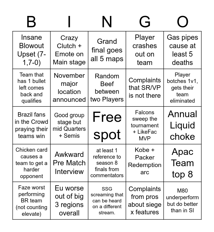 This bingo card has a free space and 24 words: Awkward Pre Match Interview, Eu worse out of big 3 regions overall, Random Beef between two Players, Faze worst performing BR team (not counting elevate), Gas pipes cause at least 5 deaths, Insane Blowout Upset (7-1,7-0), Team that has 1 bullet left comes back and qualifies, Crazy Clutch + Emote on Main stage, Falcons sweep the tournament + LikeFac MVP, at least 1 reference to season 8 finals from commentators, Complaints that SR/VP is not there, Brazil fans in the Crowd praying their teams win, Kobe + Packer Redemption arc, Apac Team top 8, November major location announced, Complaints from pros about siege x features, Annual Liquid choke, Grand final goes all 5 maps, Player botches 1v1, gets their team eliminated, Good group stage but mid Quarters + Semis, M80 underperform but do better than in SI, Chicken card causes a team to get a harder opponent, Player crashes out on team and SSG screaming that can be heard on a different stream..