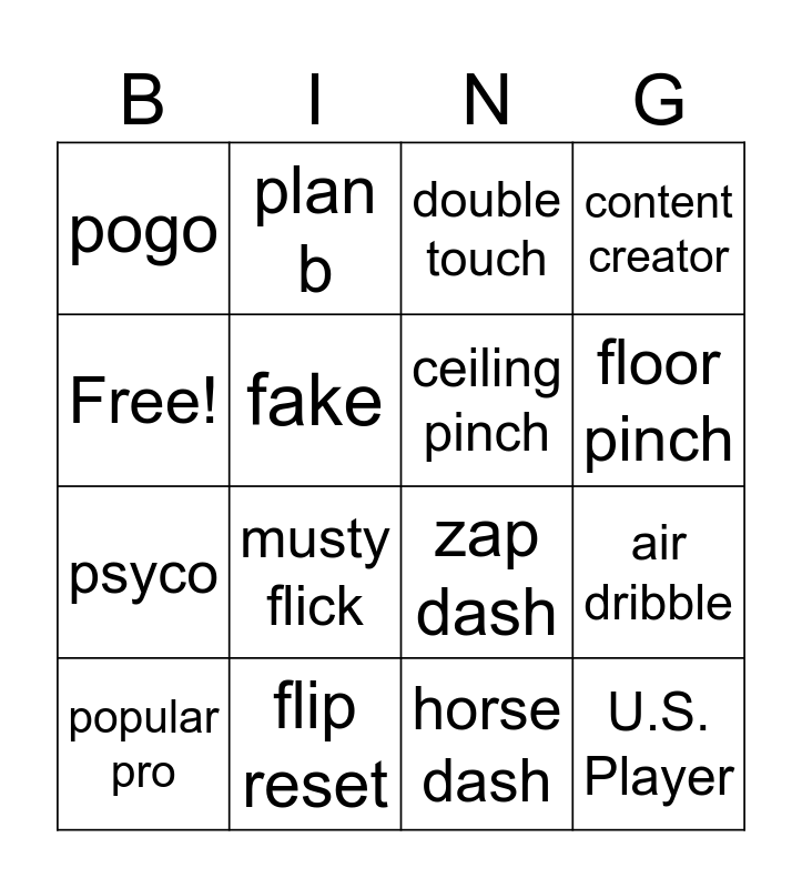 This bingo card has 16 words: flip reset, air dribble, double touch, pogo, psyco, plan b, zap dash, horse dash, Free!, fake, popular pro, content creator, musty flick, floor pinch, ceiling pinch and U.S. Player.