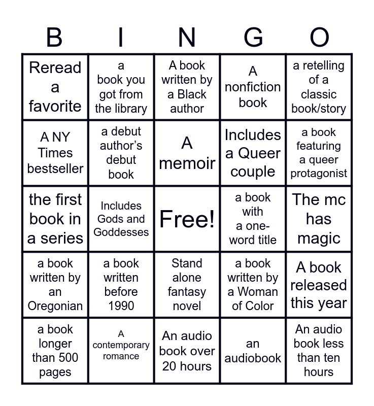 This bingo card has a free space and 34 words: a book shorter than 100 pages, an audiobook, A Booktok Rec, A book written by a man, a book written by an Oregonian, a debut author’s debut book, a retelling of a classic book/story, a book longer than 500 pages, a book you got from the library, a book written in 2021, A memoir, A book written by a Black author, A book with a purple cover, Forced proximity, a book with a one-word title, a book featuring a queer protagonist, A contemporary romance, the first book in a series, a book written before 1990, a book written by a Woman of Color, Stand alone fantasy novel, a book from a genre you rarely read, Reread a favorite, The mc has magic, An audio book over 20 hours, An audio book less than ten hours, A nonfiction book, The last book in a series, Includes a Queer couple, A NY Times bestseller, A celebrity book club pick, Includes Gods and Goddesses, A book released this year and Dual narration.