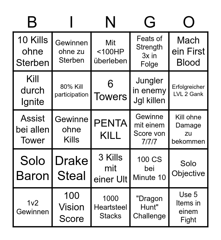 This bingo card has a free space and 24 words: Drake Steal, 100 Vision Score, 6 Towers, 1v2 Gewinnen, Mach ein First Blood, 10 Kills ohne Sterben, Kill durch Ignite, Gewinnen ohne zu Sterben, Gewinne mit einem Score von 7/7/7, 3 Kills mit einer Ult, Jungler in enemy Jgl killen, Assist bei allen Tower, 100 CS bei Minute 10, Solo Objective, 80% Kill participation, "Dragon Hunt" Challenge, Kill ohne Damage zu bekommen, Mit <100HP überleben, Erfolgreicher LVL 2 Gank, Gewinne ohne Kills, Use 5 Items in einem Fight, Solo Baron, Feats of Strength 3x in Folge and 1000 Heartsteel Stacks.