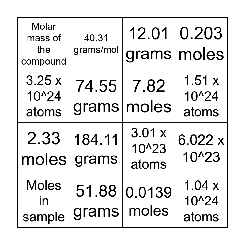 This bingo card has 16 words: 51.88 grams, 6.022 x 10^23, 12.01 grams, Molar mass of the compound, 2.33 moles, 40.31 grams/mol, 3.01 x 10^23 atoms, 0.0139 moles, 3.25 x 10^24 atoms, 74.55 grams, Moles in sample, 0.203 moles, 184.11 grams, 1.51 x 10^24 atoms, 7.82 moles and 1.04 x 10^24 atoms.