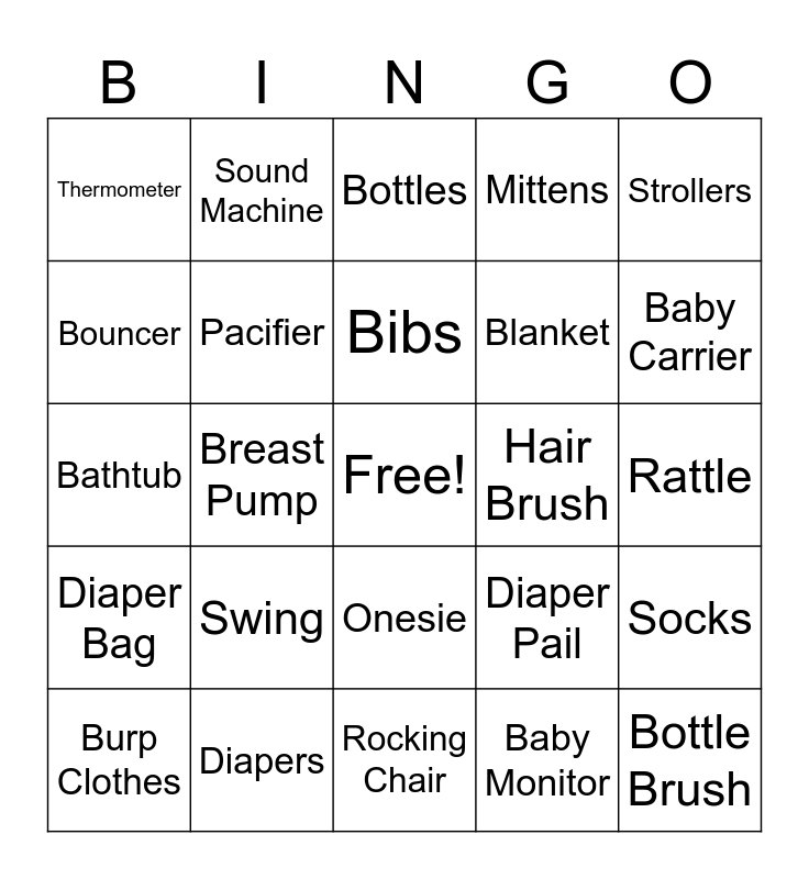 This bingo card has a free space and 29 words: Crib, Diapers, Bottles, Wipes, Strollers, Thermometer, Pacifier, Bibs, Hair Brush, Socks, Burp Clothes, Breast Pump, Baby Monitor, Bottle Brush, Bathtub, Lotion, Rocking Chair, Diaper Pail, Baby Carrier, Diaper Bag, Swing, Bath Toys, Blanket, Rattle, Bouncer, Sound Machine, Onesie, Mittens and Diaper Cream.