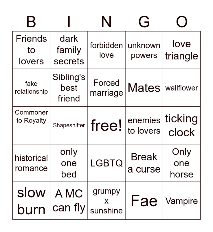 This bingo card has a free space and 24 words: only one bed, A MC can fly, Forced marriage, slow burn, love triangle, Friends to lovers, fake relationship, dark family secrets, enemies to lovers, LGBTQ, Mates, Commoner to Royalty, Break a curse, Only one horse, Sibling's best friend, Fae, ticking clock, forbidden love, wallflower, Shapeshifter, Vampire, historical romance, unknown powers and grumpy x sunshine.