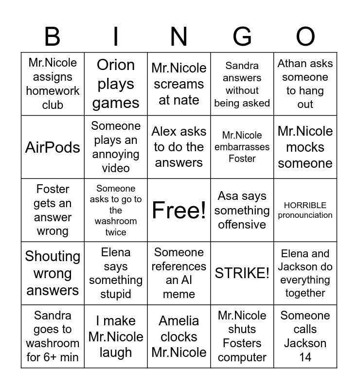 This bingo card has a free space and 24 words: Sandra goes to washroom for 6+ min, Elena says something stupid, Alex asks to do the answers, Mr.Nicole shuts Fosters computer, Athan asks someone to hang out, Mr.Nicole assigns homework club, Orion plays games, Mr.Nicole screams at nate, Asa says something offensive, HORRIBLE pronounciation, Foster gets an answer wrong, Someone plays an annoying video, STRIKE!, Elena and Jackson do everything together, AirPods, I make Mr.Nicole laugh, Amelia clocks Mr.Nicole, Sandra answers without being asked, Mr.Nicole mocks someone, Shouting wrong answers, Someone asks to go to the washroom twice, Someone references an AI meme, Mr.Nicole embarrasses Foster and Someone calls Jackson 14.