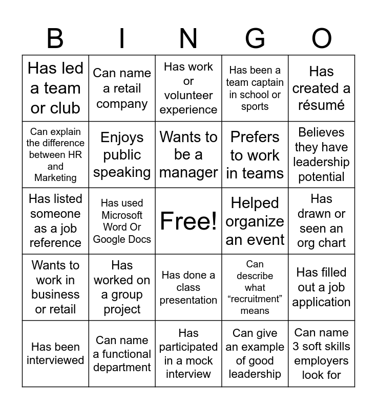 This bingo card has a free space and 24 words: Has worked on a group project, Can name a functional department, Wants to be a manager, Has been interviewed, Has created a résumé, Has led a team or club, Can explain the difference between HR and Marketing, Can name a retail company, Helped organize an event, Has done a class presentation, Prefers to work in teams, Has listed someone as a job reference, Can describe what “recruitment” means, Has filled out a job application, Enjoys public speaking, Can give an example of good leadership, Has drawn or seen an org chart, Has work or volunteer experience, Believes they have leadership potential, Has used Microsoft Word Or Google Docs, Can name 3 soft skills employers look for, Wants to work in business or retail, Has been a team captain in school or sports and Has participated in a mock interview.