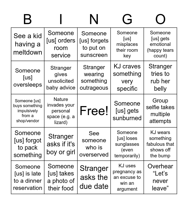 This bingo card has a free space and 28 words: KJ wears something fabulous that shows off the bump, KJ rubs her bump, KJ craves something very specific, KJ uses pregnancy as an excuse to win an argument, Someone [us] oversleeps, Someone [us] forgets to put on sunscreen, Someone [us[ orders room service, Someone [us] forgot to pack something, Someone [us] gets sunburned, Someone [us] is late to a dinner reservation, Someone [us] buys something impulsively from a shop/vendor, Someone [us] misplaces their room key, Someone [us] takes a photo of their food, Stranger asks the due date, Stranger tries to rub her belly, Stranger asks the baby’s name, Stranger asks if it's boy or girl, Stranger gives unsolicited baby advice, Stranger wearing something outrageous, See someone who is overserved, See a kid having a meltdown, Hear anyone sing or say something together (‘happy birthday,’ ‘cheers’)’, Overhear “Let’s never leave”, Nature invades your personal space (e.g. a lizard), Group selfie takes multiple attempts, Someone [us] loses sunglasses (even temporarily), Someone [us] gets emotional (happy tears count) and Someone [us] has a wardrobe malfunction (e.g., flip-flop breaks, straps snap).