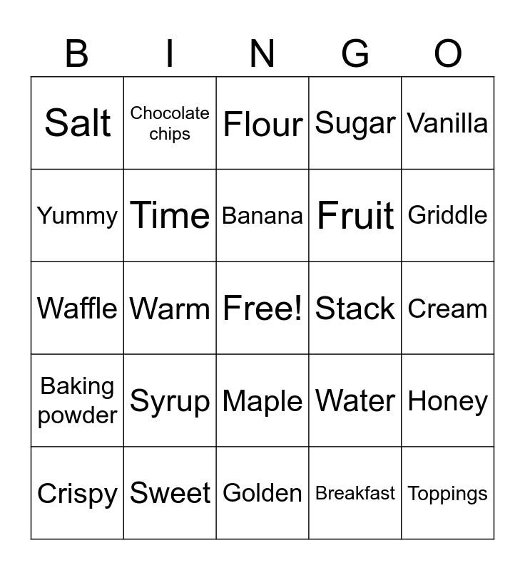 This bingo card has a free space and 29 words: Crispy, Fluffy, Warm, Milk, Salt, Flour, Time, Syrup, Stack, Sweet, Cream, Toppings, Golden, Breakfast, Griddle, Batter, Maple, Baking powder, Vanilla, Waffle, Water, Strawberries, Fruit, Yummy, Sugar, Chocolate chips, Honey, Banana and Sprinkles.