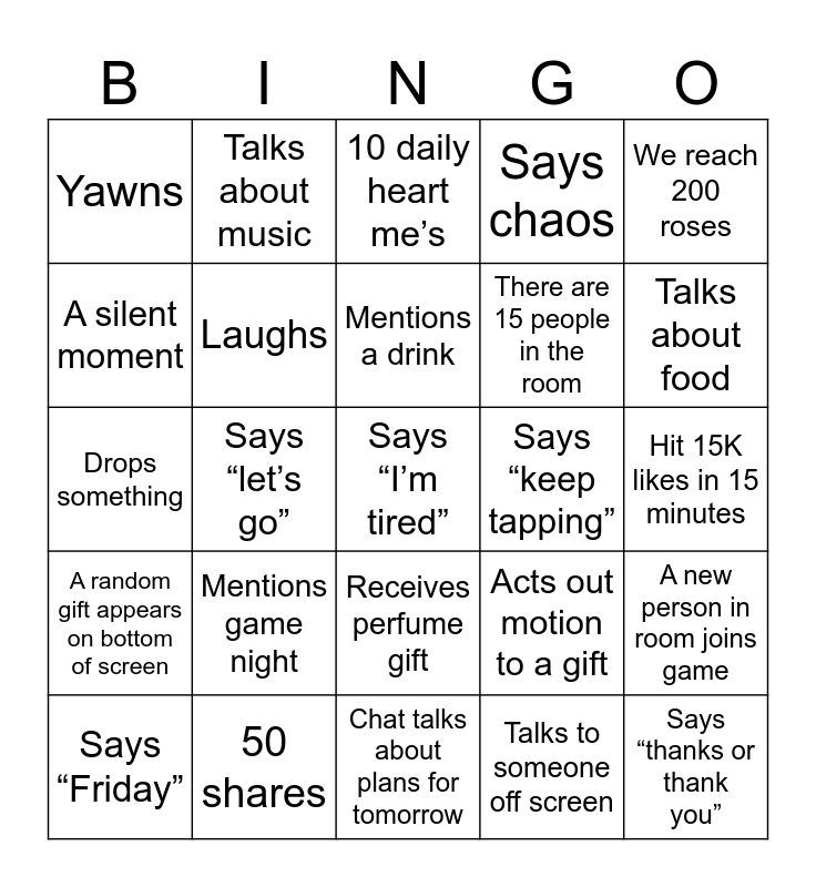 This bingo card has 35 words: Says “I can’t”, 20K Likes, Late to room asks “what are we playing”, Laughs, Receives perfume gift, Says chaos, A silent moment, Says “feral”, Mentions a drink, Says “this is fun”, Drops something, We reach 200 roses, Talks about being a Mom, Says “long day”, Yawns, Says “keep tapping”, Talks to someone off screen, Says “let’s go”, A random gift appears on bottom of screen, Says “I’m tired”, Acts out motion to a gift, Says “Friday”, A new person in room joins game, 50 shares, 10 daily heart me’s, Talks about food, Says “thanks or thank you”, Gets out of seat, There are 15 people in the room, Hit 15K likes in 15 minutes, Says “weekend”, Chat talks about plans for tomorrow, Mentions game night, Talks about music and Plays a country song.