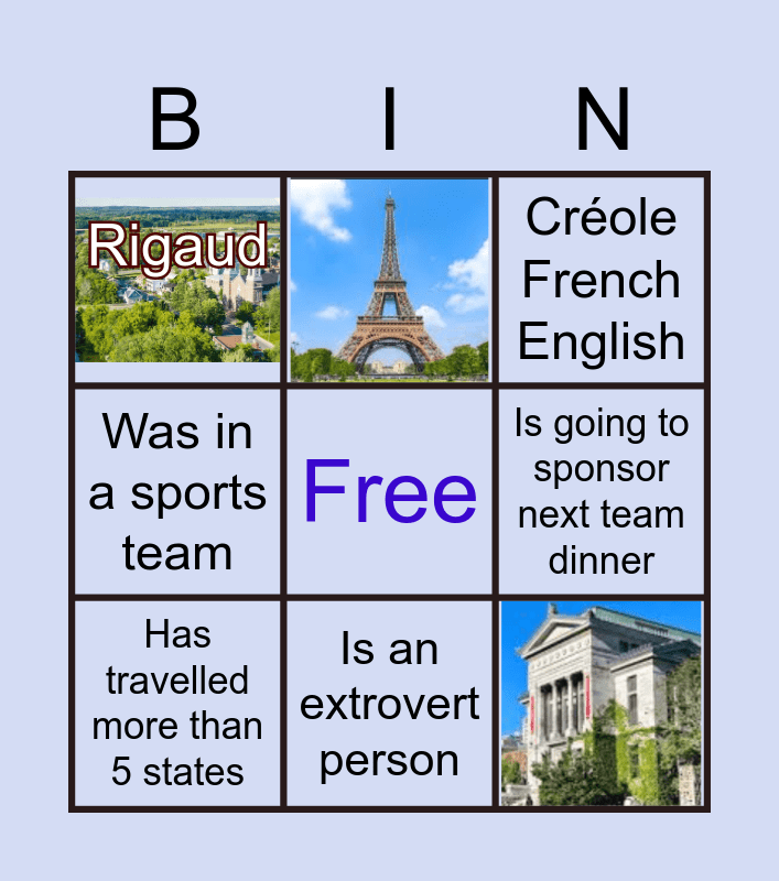 This bingo card has 5 images, a free space and 20 words: Nico, on average 4h, Rigaud, Créole French English, Favorite color is Green, Has taken sick leave when not sick, Likes Yerawada office more than Kharadi one, Loves going out on adventures, Has acted in a play, Is left handed person, Has travelled more than 5 states, Has more than 2 pets, Has an amazing garden, Was in a sports team, Is an extrovert person, Favorite genre of movie is horror, Has had surgery of some kind, Likes pineapple on Pizza, Is going to sponsor next team dinner and Is going to take us all on a road trip.