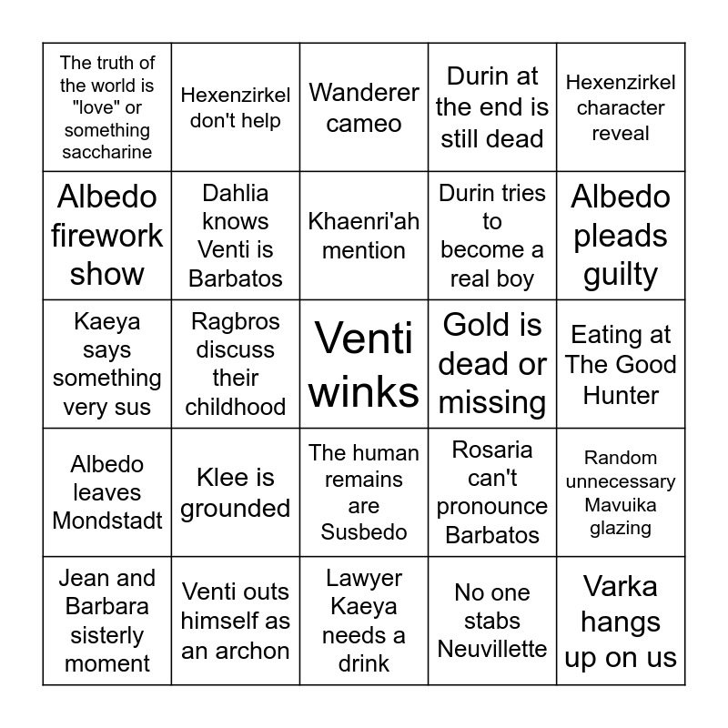 This bingo card has a free space and 24 words: Klee is grounded, Venti outs himself as an archon, Khaenri'ah mention, Jean and Barbara sisterly moment, Hexenzirkel character reveal, The truth of the world is "love" or something saccharine, Albedo firework show, Hexenzirkel don't help, Gold is dead or missing, The human remains are Susbedo, Durin tries to become a real boy, Kaeya says something very sus, Rosaria can't pronounce Barbatos, Random unnecessary Mavuika glazing, Dahlia knows Venti is Barbatos, No one stabs Neuvillette, Eating at The Good Hunter, Wanderer cameo, Albedo pleads guilty, Ragbros discuss their childhood, Varka hangs up on us, Albedo leaves Mondstadt, Durin at the end is still dead and Lawyer Kaeya needs a drink.