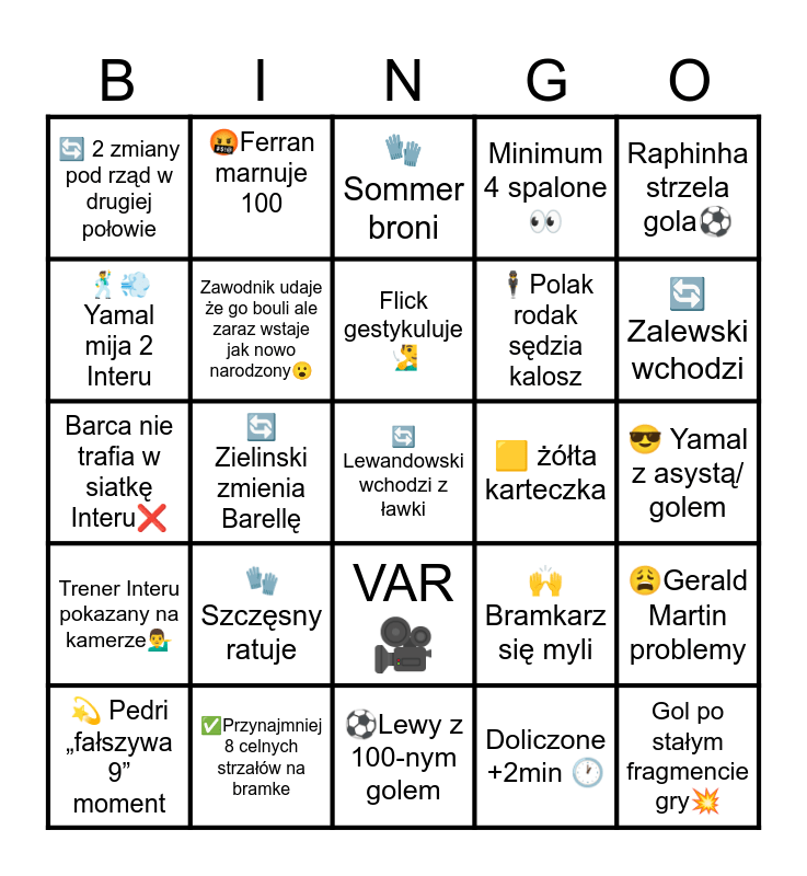 This bingo card has a free space and 24 words: 🧤 Szczęsny ratuje, ✅Przynajmniej 8 celnych strzałów na bramke, Flick gestykuluje🧏♂️, 💫 Pedri „fałszywa 9” moment, Raphinha strzela gola⚽, 🔄 2 zmiany pod rząd w drugiej połowie, 🕺💨Yamal mija 2 Interu, 🤬Ferran marnuje 100, 🟨 żółta karteczka, VAR 🎥, 🕴️Polak rodak sędzia kalosz, Barca nie trafia w siatkę Interu❌, 🙌Bramkarz się myli, 😩Gerald Martin problemy, Zawodnik udaje że go bouli ale zaraz wstaje jak nowo narodzony😮, Doliczone +2min 🕐, 😎 Yamal z asystą/ golem, 🧤Sommer broni, 🔄 Zalewski wchodzi, 🔄 Zielinski zmienia Barellę, Gol po stałym fragmencie gry💥, Trener Interu pokazany na kamerze💁♂️, Minimum 4 spalone👀 and ⚽Lewy z 100-nym golem.