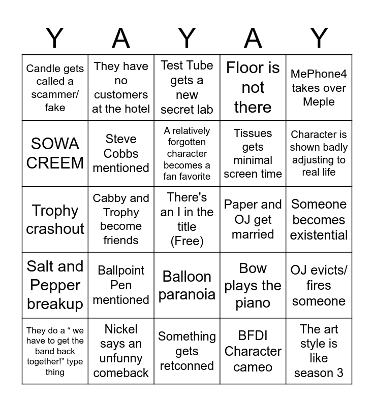 This bingo card has a free space and 24 words: Ballpoint Pen mentioned, Nickel says an unfunny comeback, A relatively forgotten character becomes a fan favorite, They do a “ we have to get the band back together!” type thing, MePhone4 takes over Meple, Candle gets called a scammer/ fake, SOWA CREEM, They have no customers at the hotel, Paper and OJ get married, Balloon paranoia, Tissues gets minimal screen time, Trophy crashout, Bow plays the piano, OJ evicts/ fires someone, Steve Cobbs mentioned, BFDI Character cameo, Someone becomes existential, Test Tube gets a new secret lab, Character is shown badly adjusting to real life, Cabby and Trophy become friends, The art style is like season 3, Salt and Pepper breakup, Floor is not there and Something gets retconned.