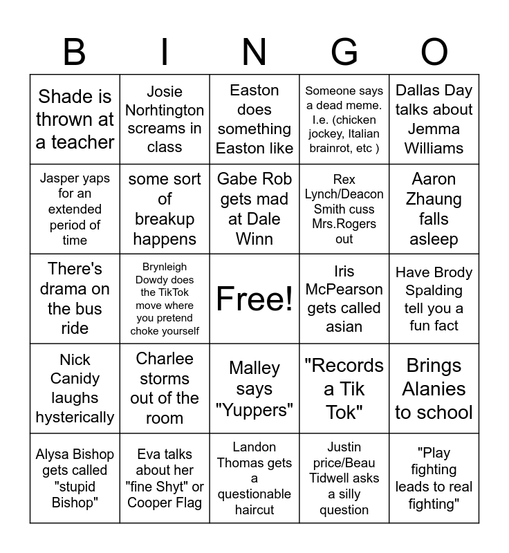 This bingo card has a free space and 34 words: Kenton makes a joke about doing something to himself or draws LeBron., Justin price/Beau Tidwell asks a silly question, Hunter talks about a president lesson, Brindley powell poses for snap, Nick Canidy laughs hysterically, some sort of breakup happens, Dallas Day talks about Jemma Williams, Alysa Bishop gets called "stupid Bishop", Josie Norhtington screams in class, Kasen Whybark talks about someone above or below his age, Gabe Rob gets mad at Dale Winn, Easton does something Easton like, "Wears to much cologne /perfume", "Applies lip gloss", Iris McPearson gets called asian, Aaron Zhaung falls asleep, Eva talks about her "fine Shyt" or Cooper Flag, There's drama on the bus ride, Charlee storms out of the room, "Records a Tik Tok", Malley says "Yuppers", Eden and Jackson match outfits, Shade is thrown at a teacher, Have Brody Spalding tell you a fun fact, Landon Thomas gets a questionable haircut, "Play fighting leads to real fighting", Someone says a dead meme. I.e. (chicken jockey, Italian brainrot, etc ), Candice Gunn Stresses over school work, Rex Lynch/Deacon Smith cuss Mrs.Rogers out, Jasper yaps for an extended period of time, Keagan listens to music (If its Juice World, mark off another box of your choice), Brynleigh Dowdy does the TikTok move where you pretend choke yourself, Brings Alanies to school and Chase makes a goofy ahh noise.