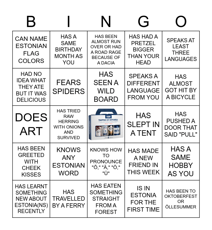 This bingo card has a free space and 24 words: KNOWS ANY ESTONIAN WORD, HAS TRAVELLED BY A FERRY, HAS SEEN A WILD BOARD, HAS LEARNT SOMETHING NEW ABOUT ESTONIA(NS) RECENTLY, SPEAKS AT LEAST THREE LANGUAGES, CAN NAME ESTONIAN FLAG COLORS, HAD NO IDEA WHAT THEY ATE BUT IT WAS DELICIOUS, HAS A SAME BIRTHDAY MONTH AS YOU, HAS SLEPT IN A TENT, KNOWS HOW TO PRONOUNCE "Õ," "Ä," "Ö," "Ü", SPEAKS A DIFFERENT LANGUAGE FROM YOU, DOES ART, HAS MADE A NEW FRIEND IN THIS WEEK, HAS A SAME HOBBY AS YOU, FEARS SPIDERS, IS IN ESTONIA FOR THE FIRST TIME, HAS PUSHED A DOOR THAT SAID "PULL", HAS BEEN ALMOST RUN OVER OR HAD A ROAD RAGE BECAUSE OF A DACIA, HAS ALMOST GOT HIT BY A BICYCLE, HAS TRIED RAW HERRING WITH ONIONS AND SURVIVED, HAS BEEN TO OKTOBERFEST OR ÕLLESUMMER, HAS BEEN GREETED WITH CHEEK KISSES, HAS HAD A PRETZEL BIGGER THAN YOUR HEAD and HAS EATEN SOMETHING STRAIGHT FROM A FOREST.