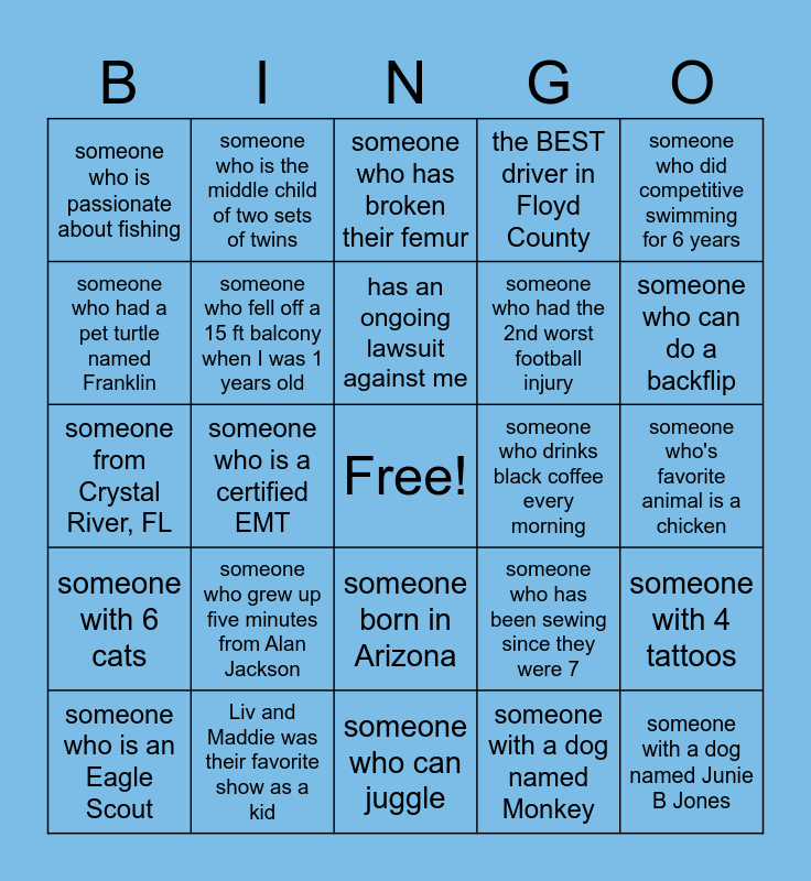 This bingo card has a free space and 24 words: someone who grew up five minutes from Alan Jackson, Liv and Maddie was their favorite show as a kid, has an ongoing lawsuit against me, someone who is an Eagle Scout, someone who did competitive swimming for 6 years, someone who is passionate about fishing, someone who had a pet turtle named Franklin, someone who is the middle child of two sets of twins, someone who drinks black coffee every morning, someone born in Arizona, someone who had the 2nd worst football injury, someone from Crystal River, FL, someone who has been sewing since they were 7, someone with 4 tattoos, someone who fell off a 15 ft balcony when I was 1 years old, someone with a dog named Monkey, someone who's favorite animal is a chicken, someone who has broken their femur, someone who can do a backflip, someone who is a certified EMT, someone with a dog named Junie B Jones, someone with 6 cats, the BEST driver in Floyd County and someone who can juggle.