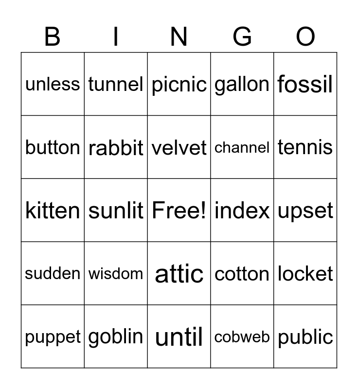 This bingo card has a free space and 30 words: goblin, admit, sunlit, bandit, unless, picnic, rabbit, attic, index, until, upset, public, cobweb, publish, tennis, nutmeg, cotton, sudden, wisdom, fossil, kitten, happen, tunnel, channel, button, gallon, locket, puppet, velvet and magnet.