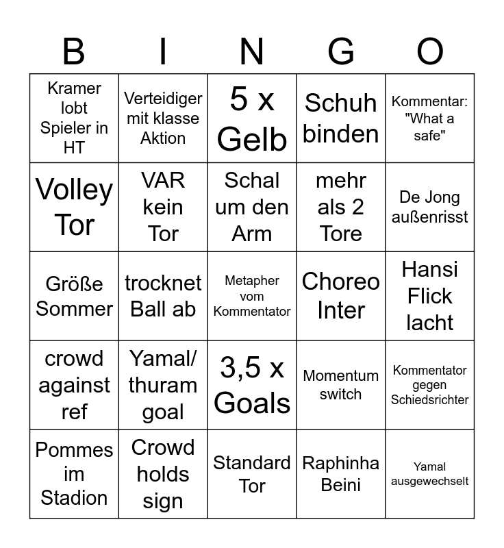 This bingo card has a free space and 24 words: Yamal/ thuram goal, Crowd holds sign, Schal um den Arm, Pommes im Stadion, Kommentar: "What a safe", Kramer lobt Spieler in HT, Volley Tor, Verteidiger mit klasse Aktion, Choreo Inter, 3,5 x Goals, mehr als 2 Tore, Größe Sommer, Momentum switch, Kommentator gegen Schiedsrichter, VAR kein Tor, Raphinha Beini, Hansi Flick lacht, 5 x Gelb, De Jong außenrisst, trocknet Ball ab, Yamal ausgewechselt, crowd against ref, Schuh binden and Standard Tor.