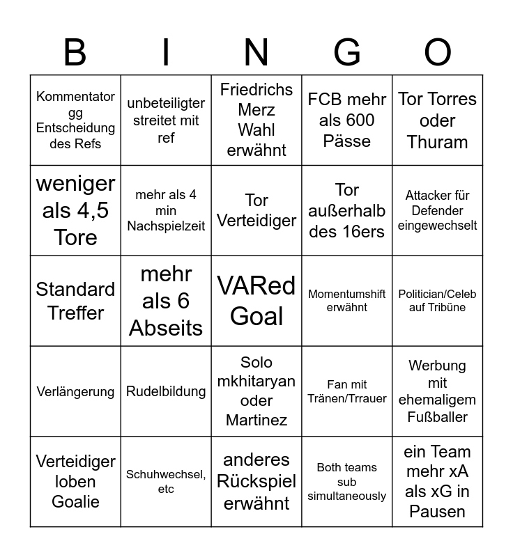 This bingo card has a free space and 24 words: Rudelbildung, Schuhwechsel, etc, Tor Verteidiger, Verteidiger loben Goalie, Tor Torres oder Thuram, Kommentator gg Entscheidung des Refs, weniger als 4,5 Tore, unbeteiligter streitet mit ref, Momentumshift erwähnt, Solo mkhitaryan oder Martinez, Tor außerhalb des 16ers, Standard Treffer, Fan mit Tränen/Trrauer, Werbung mit ehemaligem Fußballer, mehr als 4 min Nachspielzeit, Both teams sub simultaneously, Politician/Celeb auf Tribüne, Friedrichs Merz Wahl erwähnt, Attacker für Defender eingewechselt, mehr als 6 Abseits, ein Team mehr xA als xG in Pausen, Verlängerung, FCB mehr als 600 Pässe and anderes Rückspiel erwähnt.