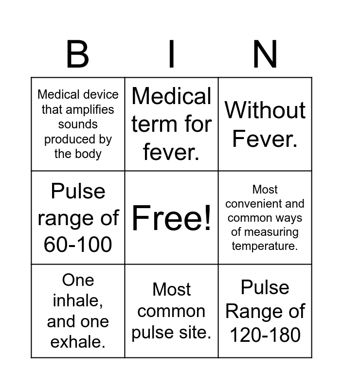 This bingo card has a free space and 14 words: 97°F to 99°F, Vague sense of body discomfort, weakness, and fatigue., One inhale, and one exhale., Medical term for fever., Pulse range of 60-100, Pulse Range of 120-180, Located in a groove on the inner aspect of the wrist, below the thumb., What gender has a slightly faster pulse rate., Most common pulse site., Medical device that amplifies sounds produced by the body, Sounds used to determine systolic and diastolic blood pressure readings., Most convenient and common ways of measuring temperature., Without Fever. and Recommended site for measuring temperature in toddlers and preschoolers.