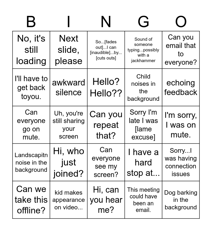 This bingo card has 25 words: Hi, who just joined?, Hi, can you hear me?, Hello? Hello??, Can we take this offline?, Can you email that to everyone?, No, it's still loading, I'll have to get back toyou., Next slide, please, Sorry I'm late I was [lame excuse], Can everyone see my screen?, Child noises in the background, Can everyone go on mute., I have a hard stop at..., Sorry...I was having connection issues, awkward silence, Dog barking in the background, I'm sorry, I was on mute., So...[fades out]...I can [inaudible]...by...[cuts outs], echoing feedback, Uh, you're still sharing your screen, Can you repeat that?, kid makes appearance on video..., Landscapitn noise in the background, Sound of someone typing...possibly with a jackhammer and This meeting could have been an email..