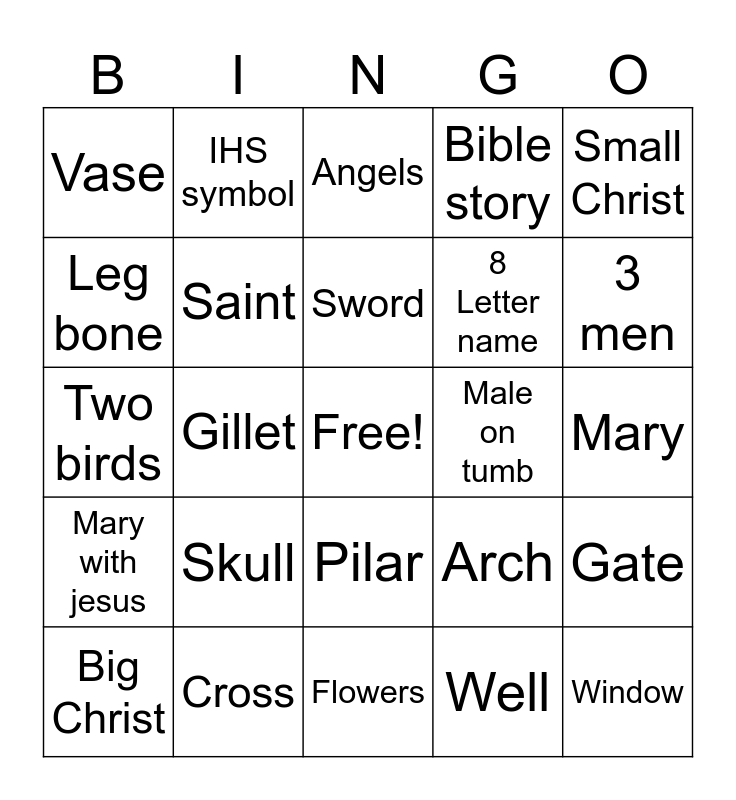 This bingo card has a free space and 24 words: Skull, Cross, Sword, Big Christ, Small Christ, Vase, Leg bone, IHS symbol, Male on tumb, Pilar, 8 Letter name, Two birds, Arch, Gate, Saint, Well, Mary, Angels, 3 men, Gillet, Window, Mary with jesus, Bible story and Flowers.