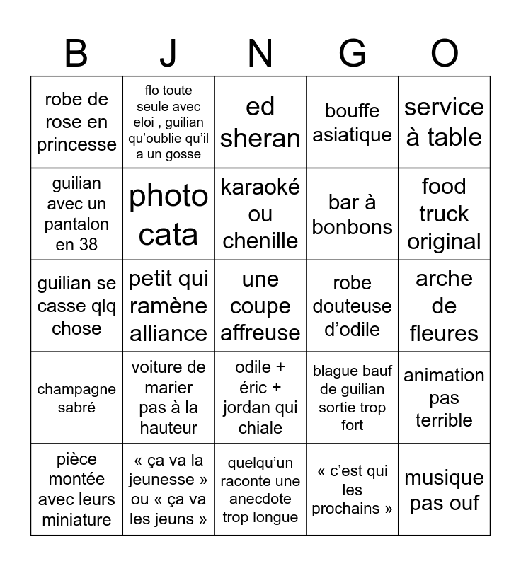 This bingo card has a free space and 24 words: voiture de marier pas à la hauteur, « ça va la jeunesse » ou « ça va les jeuns », karaoké ou chenille, pièce montée avec leurs miniature, service à table, robe de rose en princesse, guilian avec un pantalon en 38, flo toute seule avec eloi , guilian qu’oublie qu’il a un gosse, robe douteuse d’odile, odile + éric + jordan qui chiale, bar à bonbons, guilian se casse qlq chose, blague bauf de guilian sortie trop fort, animation pas terrible, photo cata, « c’est qui les prochains », arche de fleures, ed sheran, food truck original, petit qui ramène alliance, musique pas ouf, champagne sabré, bouffe asiatique and quelqu’un raconte une anecdote trop longue.